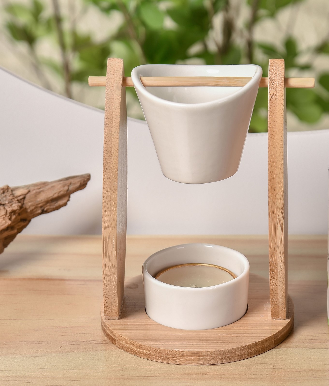 Dans la seconde pièce en céramique, placez une bougie chauffe-plat à l'intérieur et placez-la sur le socle en bambou. Juste en dessous du réservoir suspendu.